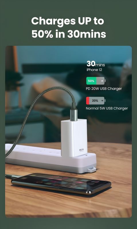 Get lightning-fast charging with the ECO 20W PD 3.0 Fast Wall Charger, designed for smart and safe power delivery. This high-speed adapter supports both Type-C and USB output ports, allowing you to charge multiple devices efficiently at the same time. With 20W Power Delivery (PD 3.0) technology, it ensures rapid charging for all compatible smartphones, including Android and iPhone models. Built with over-voltage, over-current, and short-circuit protection, this charger guarantees safe and reliable charging every time. Its compact and lightweight design makes it easy to carry anywhere, whether at home, office, or while traveling. Crafted with high-quality materials and advanced chipset technology, the ECO 20W charger delivers smart, fast, and efficient charging without overheating. Proudly Made in India, this charger is compatible with most USB-powered devices, making it the perfect choice for everyday charging needs.